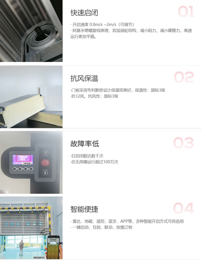 - 频繁开启:快速门电机,适应频繁开启,日开启次数可达1000次