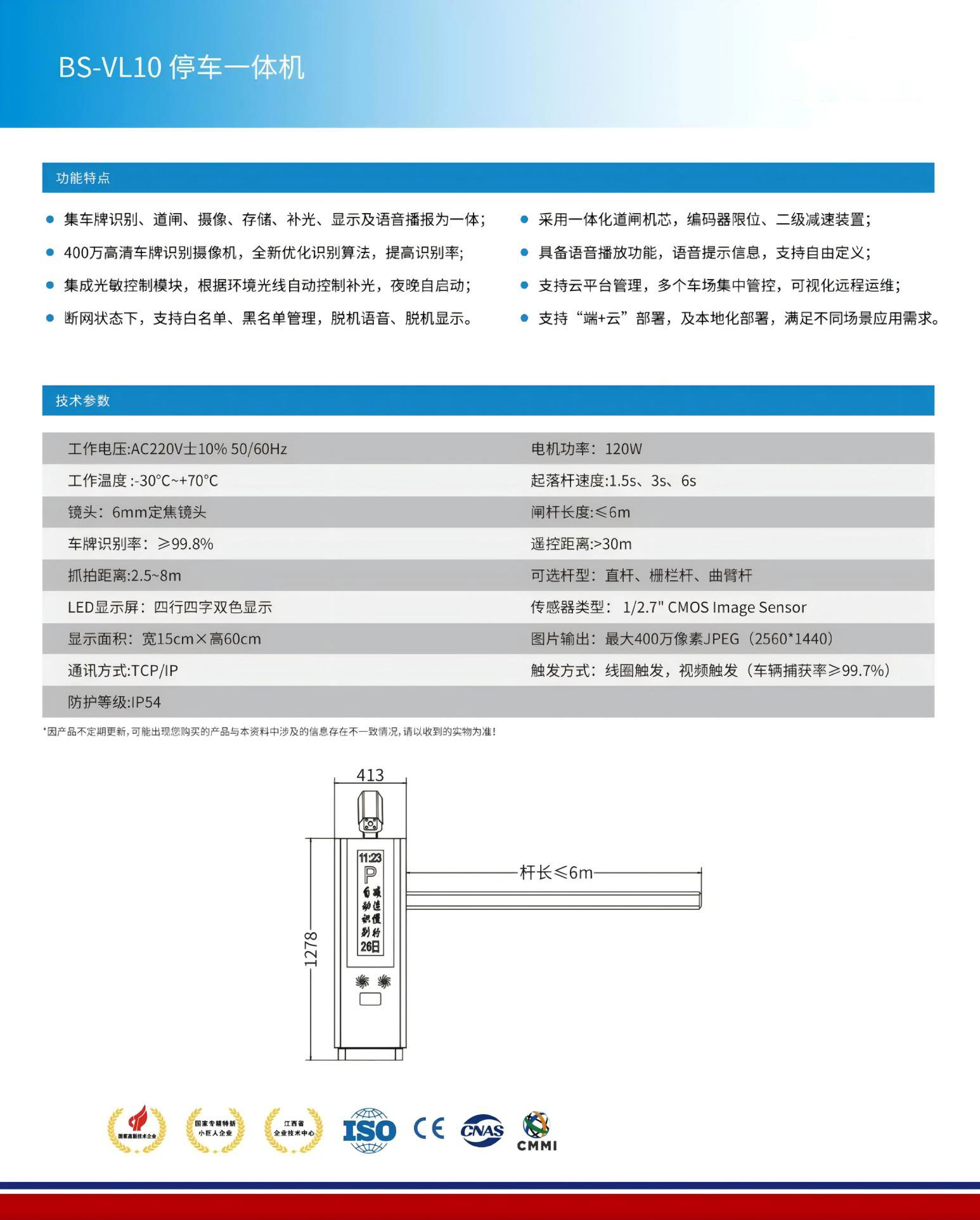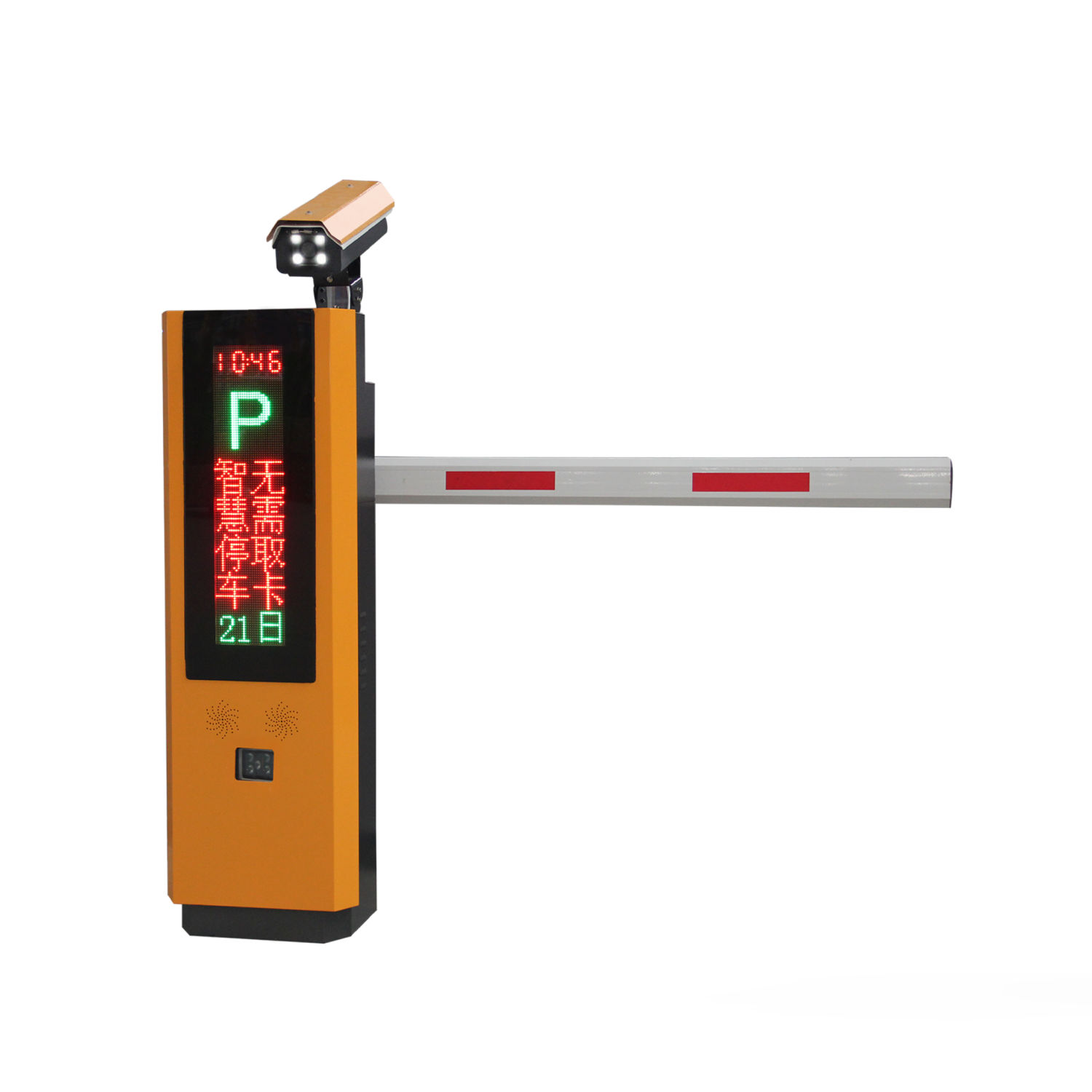 ●集车牌识别、道闸、摄像、存储、补光、显示及语音播报为一体;